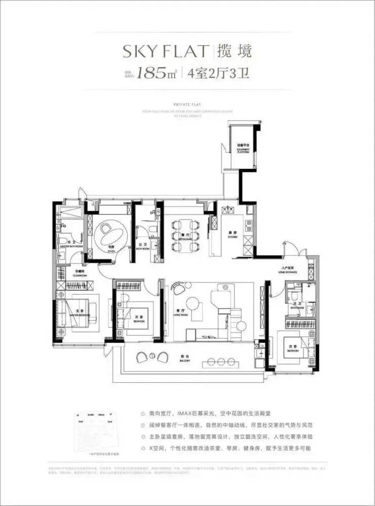 【建面约185㎡户型】:4房2厅3卫,尺度更进一步,IMAX巨幕采光视野,客厅延展出去集会客休闲于一体。