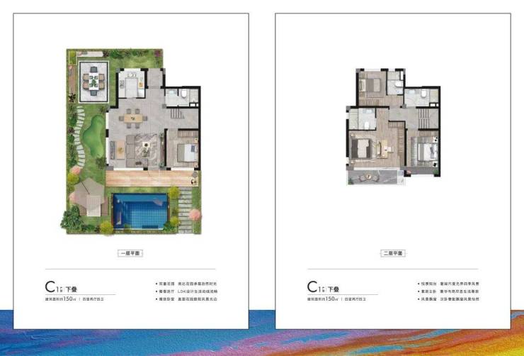 150㎡上叠:三室两厅三卫,主卧带独立卫浴+衣帽间+全景飘窗,推窗即见湿地绿意;