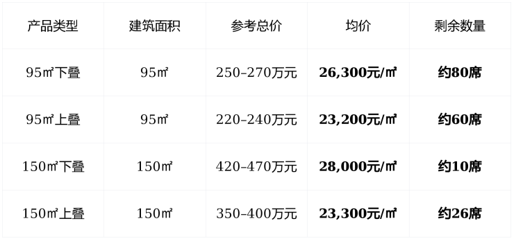 整体均价约23,000–28,000元/㎡,为上海全市单价最低的“低密叠墅”产品