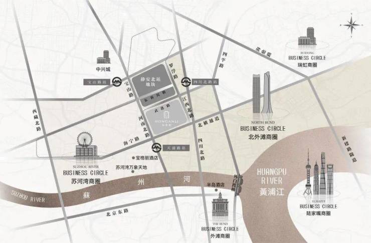3公里范围内,汇聚苏河湾万象天地、北外滩商圈、瑞虹商圈、南京西路商圈、外滩商圈、陆家嘴商圈等,东南侧步行可达18街坊,西南侧在建安康苑、湾上综合体地块。