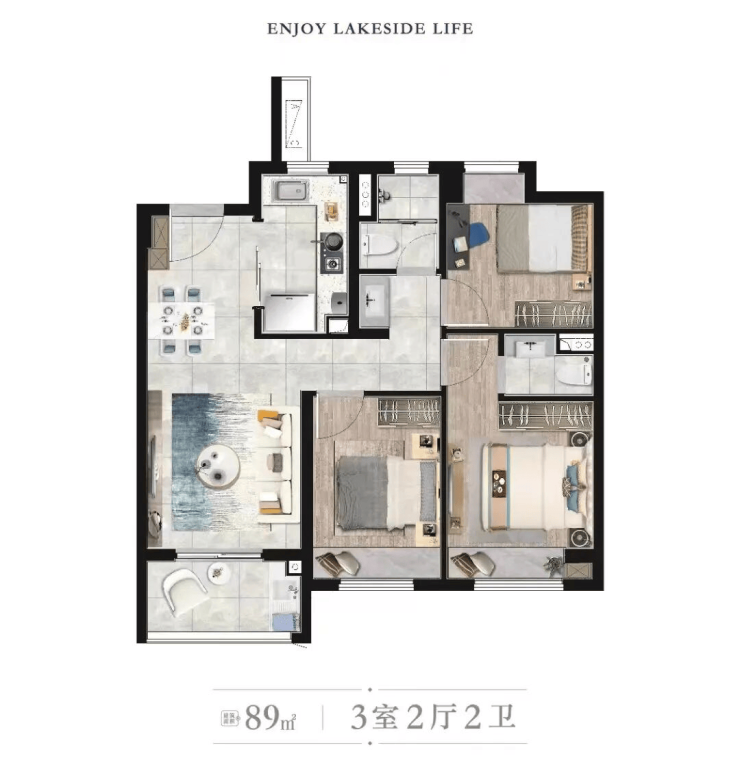 89㎡三房:三开间朝南,1.5卫设计,主卧+客厅一体化,适合三口之家;