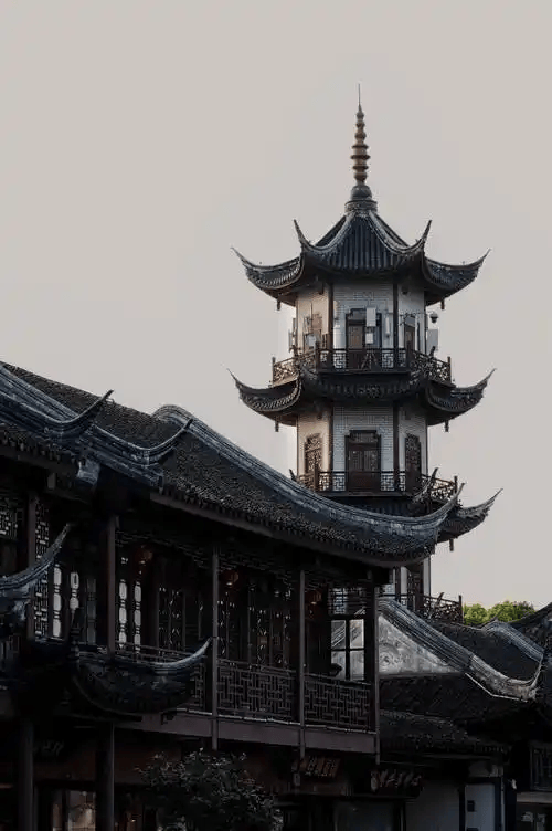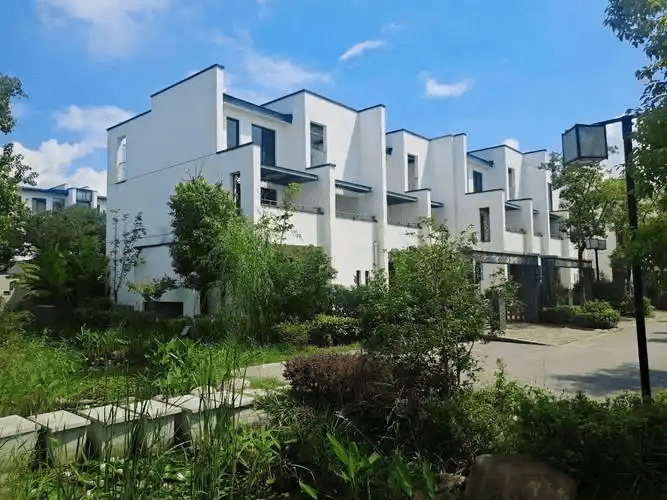 新中式美学 :白墙青瓦坡屋顶与木格窗的江南水乡元素,结合现代玻璃幕墙,形成传统与现代交融的建筑语言