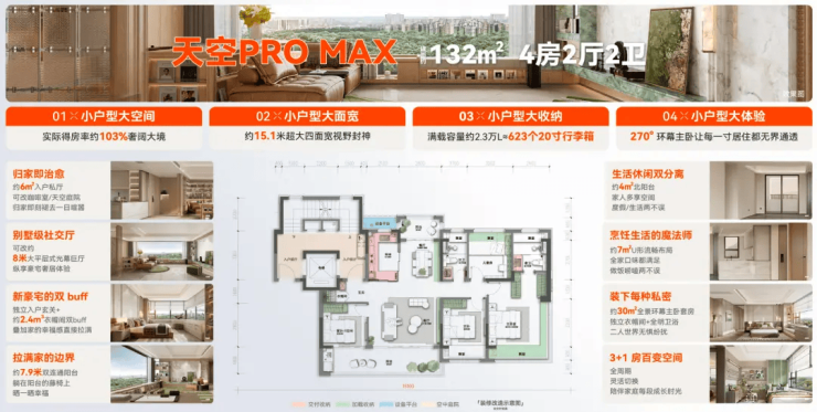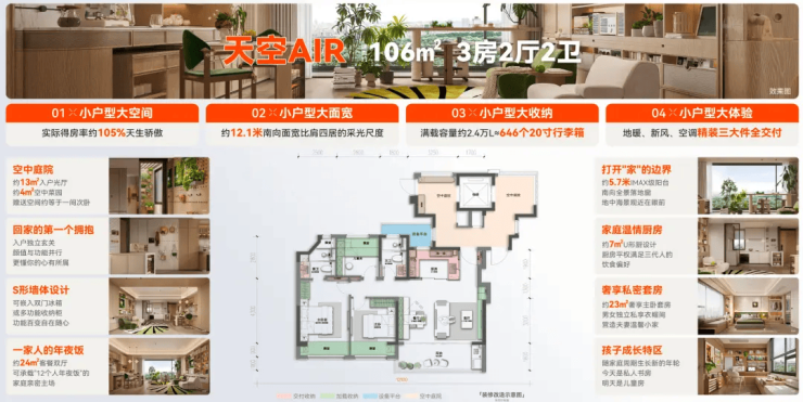 106㎡户型:作为起步户型,价格亲民,设计紧凑实用。约15.1米的面宽和270°全景飘窗,不仅提高了居住舒适度,还让自然光线充分进入居室。此外,该户型还注重收纳功能,通过S型墙体巧思、嵌入式家电位等设计,彻底解决小户型收纳痛点。