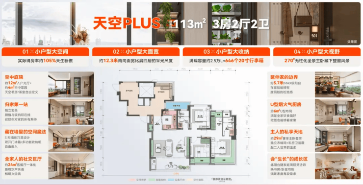 113㎡户型:作为明星户型,完全打破了“小户型就拥挤”的刻板印象。电梯出来有一个私享的入户光厅,可做成小花园或书房,归家仪式感满满。户型内部空间布局合理,动静分区明确,居住体验极佳。