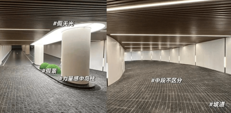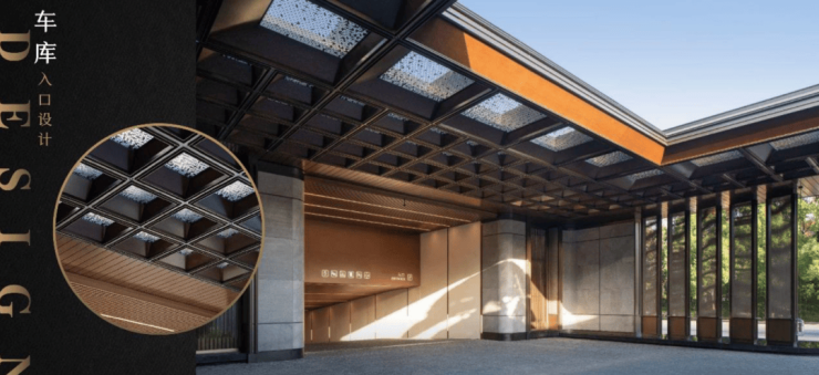 地下车库采用全铝板吊顶、环氧金磨石地面,配备环岛落客区、仿天光照明、司机休息室等设施,提供酒店式归家体验。入口门廊设计古松相迎,光影交织,营造隐奢氛围。