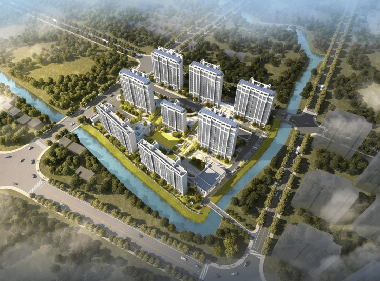 双面环水设计 :社区东西两侧紧邻人工湖与自然河道,形成天然“半岛格局”,推窗见水,归家如入画境