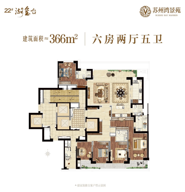 366㎡六居室:5卫设计,餐客一体,主卧双台盆卫浴,南北通透
