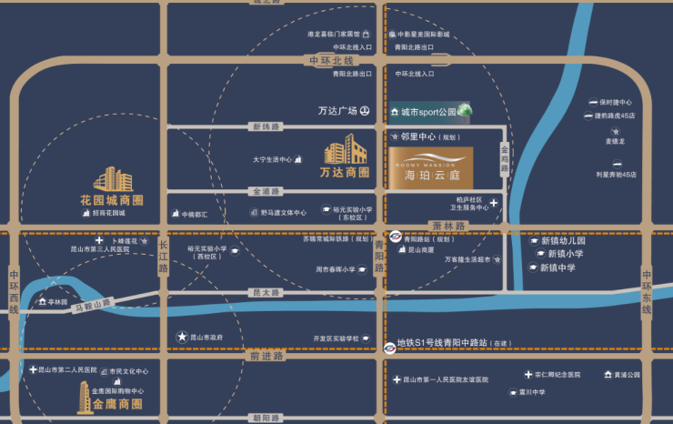 自驾:紧邻青阳北路(双向六车道)、中环北线入口,10min通达昆山主城区,18min至昆山南站,半小时可达上海虹桥