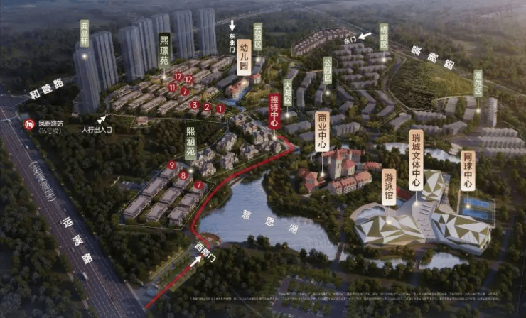 内部配套:10000㎡慧思湖、11000㎡瑞城体育文化中心(含泳池、球类场馆)、8000㎡希尔广场、5000㎡双语幼儿园