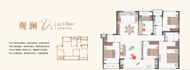 建面约136㎡户型,做到了5房2卫,南向三个卧室,四开间朝南,厨房开间更是达到约4米,南向双联阳台面宽约7.1米,尺度感拉满。