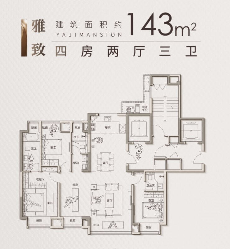 143㎡飘窗赠送面积为7.83㎡,主卧面积24㎡+飘窗2.88㎡,整个主卧面积可达26.88㎡;