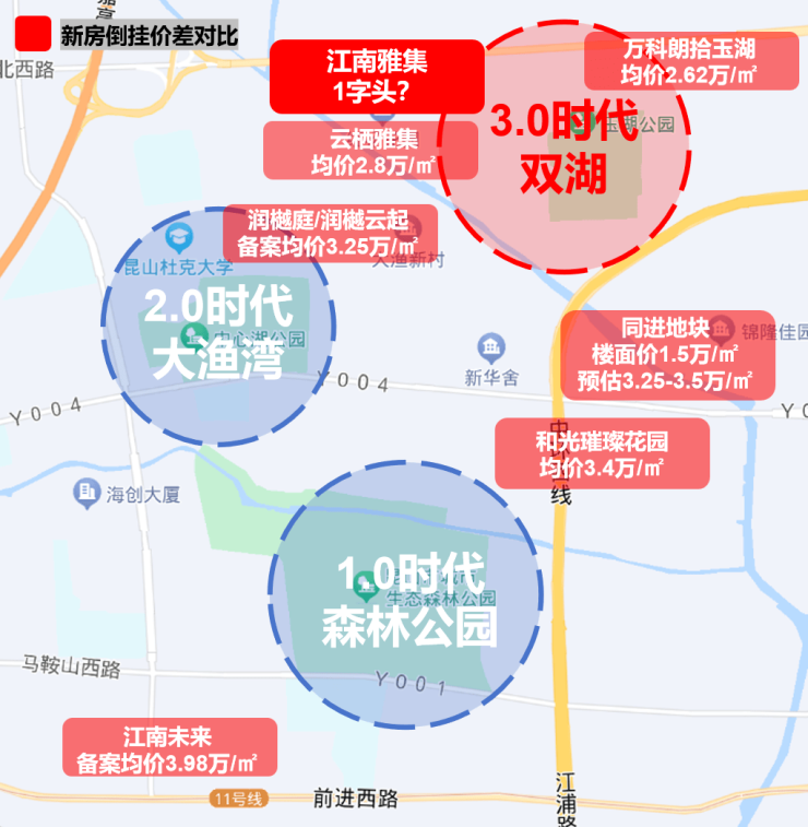 纵观昆山城西的发展,以湖为中心,可以分为三大阶段。1.0时代,森林公园-文体中心片区;2.0时代,大渔湾片区;3.0时代,以中心湖-玉湖为代表的双湖片区。如今种种迹象表明:双湖板块是城西的新中心,更是目前整个昆山最炙手可热的板块!原因一:城西目前最热的倒挂高地首先,双湖板块的出现直接打破“城西上车难”的局面,让入住城西成为可能。从图中数据可以清晰看出,与城西老核心二手房相比,双湖的新房价格有着极大优势,最大价差近2.5万/㎡,竟然高达一倍之多。