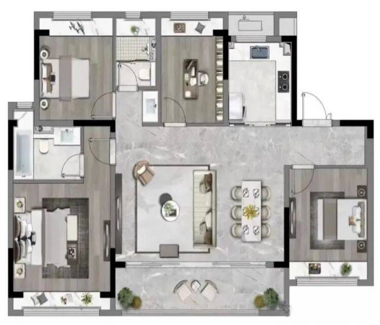136㎡四居配备双卫、独立玄关与宽景阳台,满足三代同堂居住需求,尺度媲美改善型大宅。