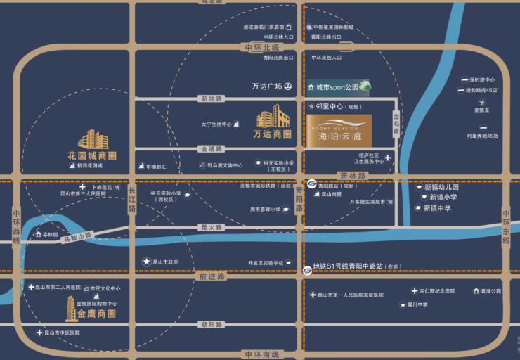 海珀云庭坐落于周市镇青阳北路与金浦路交汇处,正处北部新城核心,与万达商圈咫尺相邻,步行即可享受一站式商业配套,涵盖超市、影院、亲子休闲、特色餐饮等多元业态,满足日常消费与娱乐需求^。项目南侧一路之隔是已开放的城市运动公园,配备足球场、篮球场、轮滑场及1公里健步跑道,为业主提供家门口的运动休闲空间;北侧500米直达中环北线入口,青阳北路已改造为双向六车道,自驾10min可达昆山主城区、花桥,18min抵达昆山南站,便捷对接上海、南京等城市^。