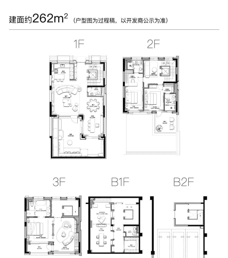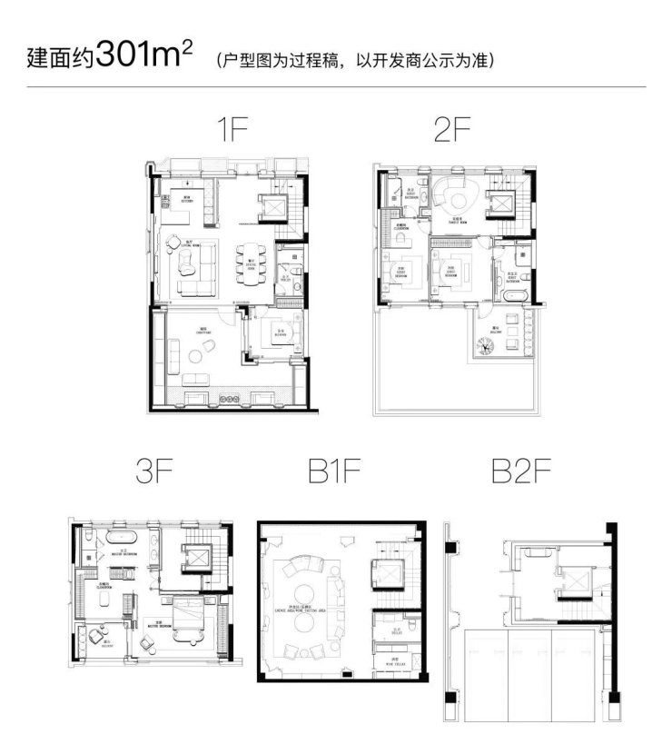 空间设计:地上三层+地下两层布局,配备独立电梯、中西双厨、双主卧套房