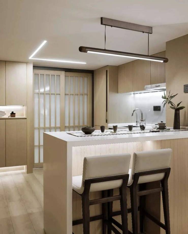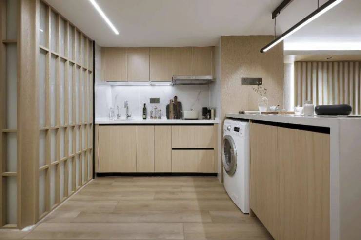 一侧的L型的厨房,洗、切、烧连贯展开。再进去是餐客厅,几乎接近市面上的90㎡尺度,能放下四人餐桌、三人沙发,靠墙还有一个大飘窗。