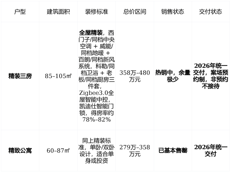 在售状态主力在售户型85–105㎡精装三房(总价358万–480万),余量稀少,2026年统一交付,样板间需预约参观,案场实行“预约制”