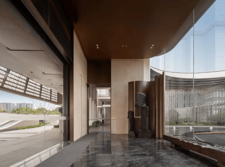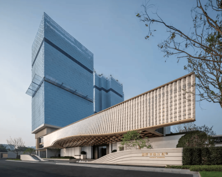 外立面采用四面铝板+大面积玻璃幕墙,搭配暖金色金属线条,灵感源自京杭大运河波光,随日光流转呈现光影变化,打造现代东方隐奢风格 。