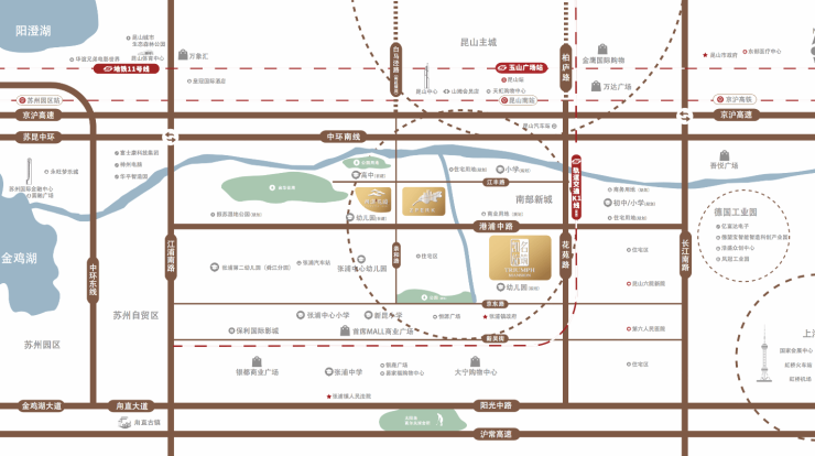自驾高效 :周边中环南线、京沪高速、沪常高速等主干道环绕,10分钟可达昆山南站,15分钟直达苏州工业园区,30分钟覆盖上海虹桥枢纽