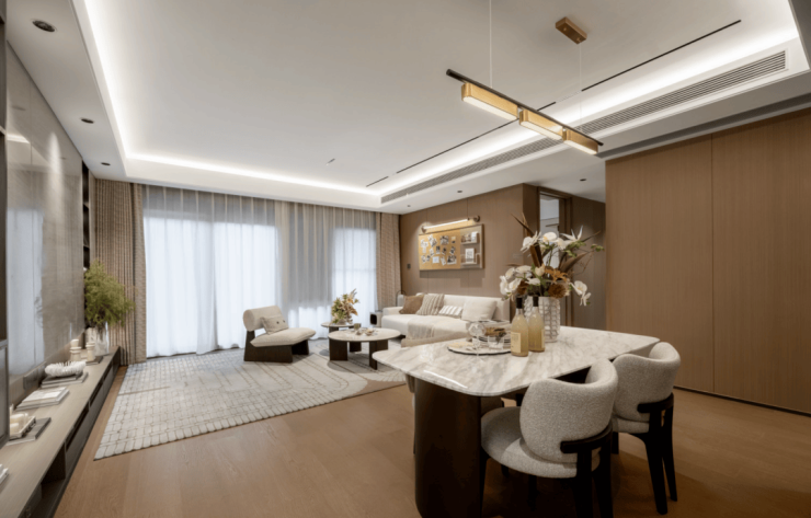 LDKG一体化的设计,形成一个超级大方厅,横向客厅约4.9米,连接约15㎡的空中大露台,可以实现很多创意空间打造。