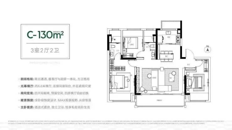 户型点评:这一户型和上个户型稍微有些不同,做的是3房2卫的套型,不过南向约6.6米横厅,可以设计为开放式书房。同样是多飘窗设计,空间感比较足!