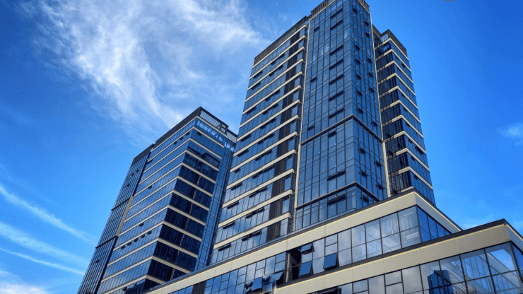 公共区采用12种进口石材铺装,外立面为全玻璃幕墙设计