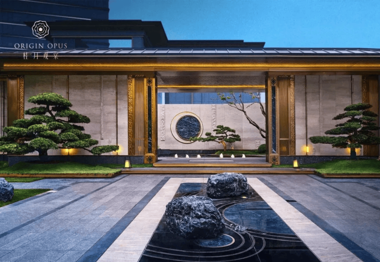 建筑风格:宋风现代美学,外立面采用宝格丽酒店同款进口维纳多奢石 + 超白玻幕墙
