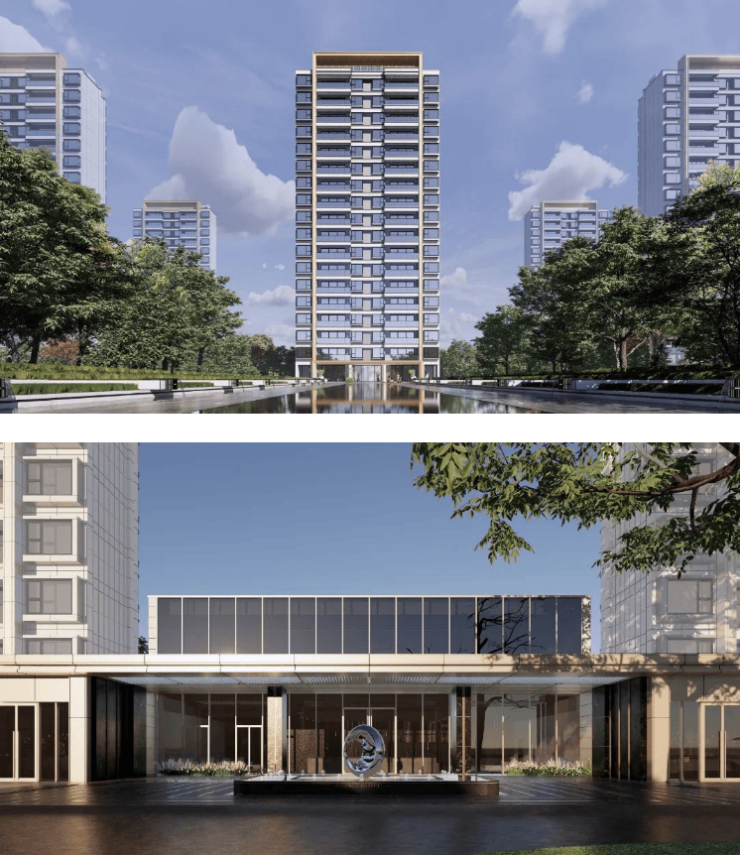 外立面采用公建化设计,米白+浅灰搭配香槟金铝板,现代感强,质感出众。