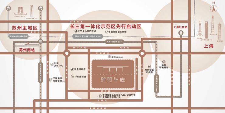 轨道交通(规划):苏州 10 号线、上海 17 号线规划于汾湖交汇,与高铁苏州南站约 5 公里,无缝衔接。