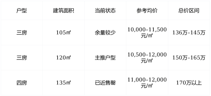 销售状态 :当前处于 清盘尾声 ,房源以105㎡与120㎡三房为主,户型选择有限,建议尽快实地看房锁定。