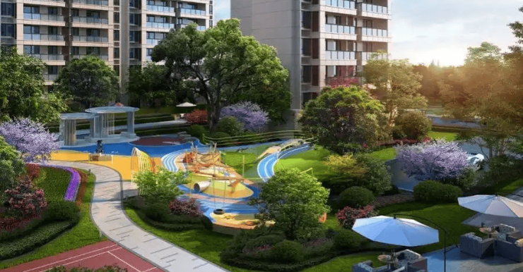 绿化率37%,打造“一环两轴七区”景观体系,含童趣时光、活力慢跑、复合运动、阳光草坪等主题空间,营造“高绿量、大宅间、多色彩”的生态社区。