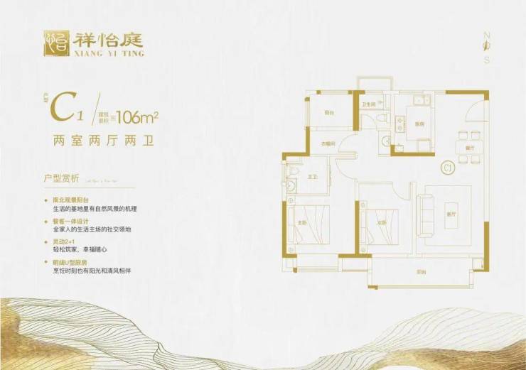 106㎡ 2+1房2厅2卫 灵动空间,3阳台户型,边套采光绝佳