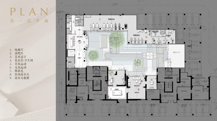 高端运动主题下沉式会所包含室内高尔夫球场、斯诺克、健身club私人运动场域,满足高端圈层的志趣共鸣。