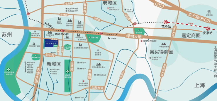 紧邻东城大道、绿地大道,连接京沪高速(花桥出入口约3公里),自驾30min至上海市中心,15min至安亭老街。