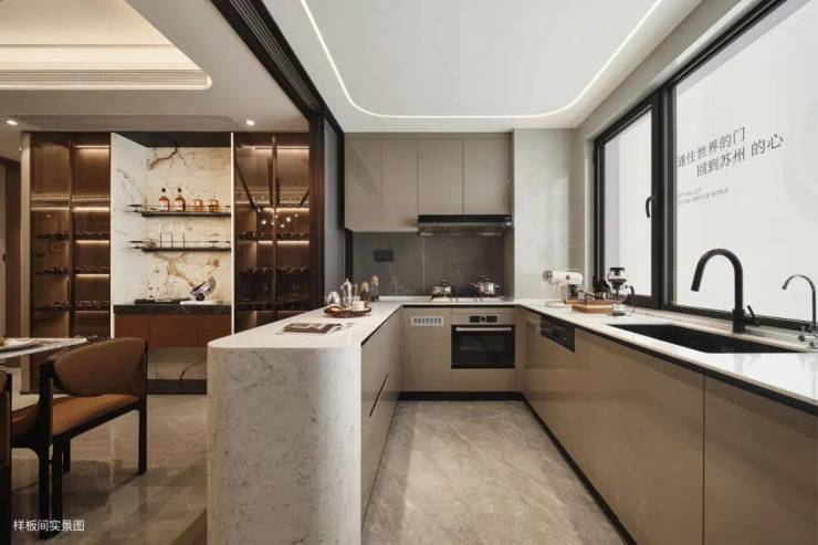 流线岛台 —— 参考园林月亮门设计室内动线中的流线笔触,柔和生活质感