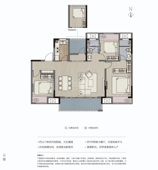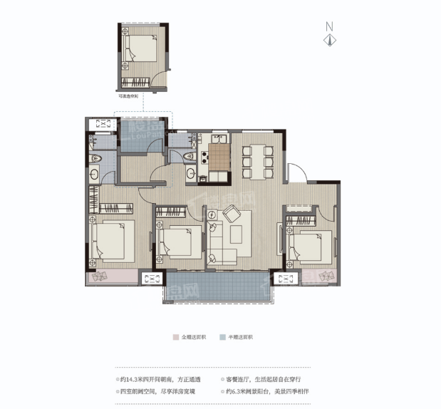 135㎡四房两厅两卫:双阳台设计,四开间朝南,功能性更强