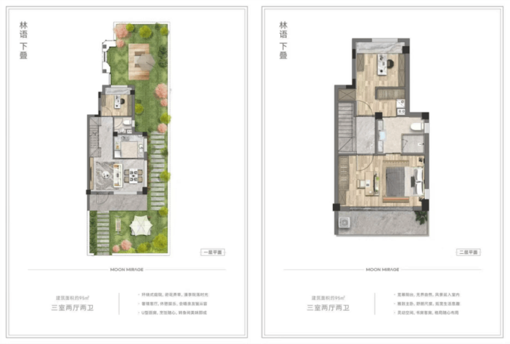 95㎡下叠:三室两厅两卫,带50–90㎡私家庭院,适合三代同堂或亲子家庭,庭院可改造成菜园、烧烤区、宠物乐园;