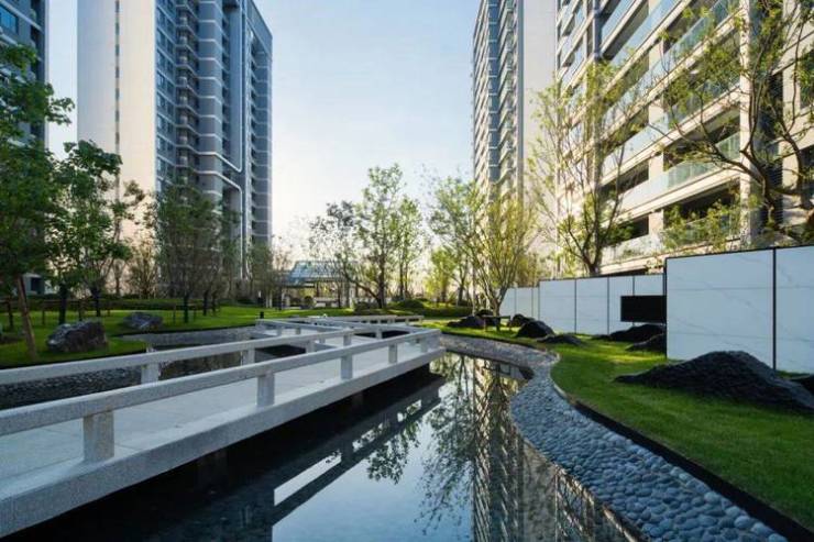 园林采用"三进四院"东方布局,移植价值70万元黄山造型油松,楼间距超40米营造静谧氛围