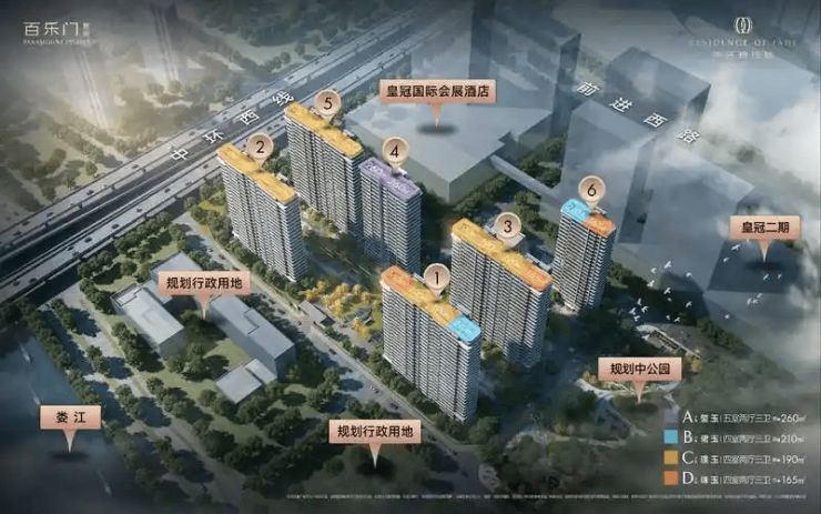 在售户型:165㎡、190㎡、210㎡、260㎡ 四种大平层,主力为190㎡四室两厅三卫,空间布局通透,LDK一体化设计,主卧带独立套房+双卫,满足三代同堂或高阶改善需求。