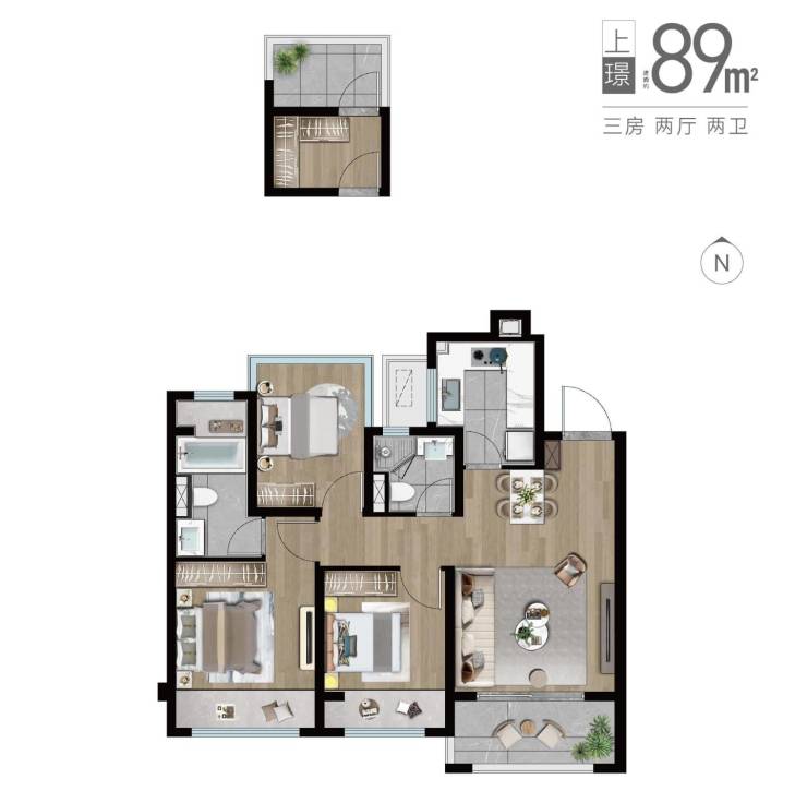89㎡三房两卫,得房率超80%,小家庭首选;