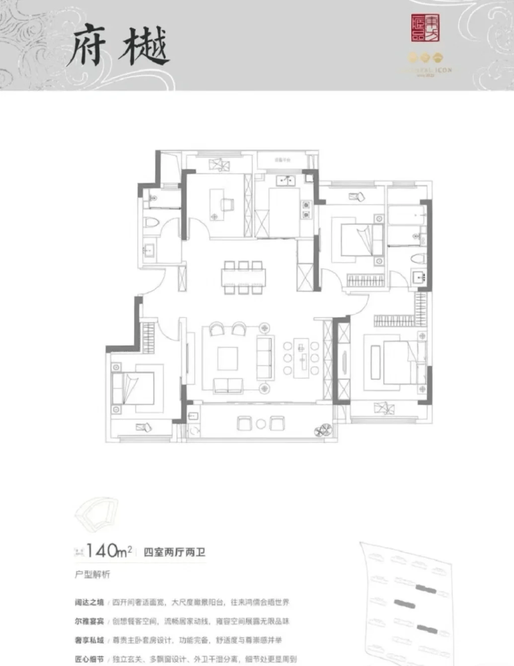 140㎡四居室:总价320-400万元,四叶草户型+6.5米横厅