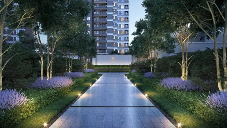 外立面采用现代轻奢风格 + 真石漆 + 浅灰铝板 + 蓝眼睛石材,立体感强,耐候抗污,十年不褪色