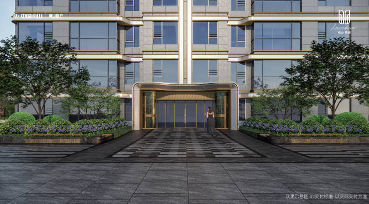 "小区主入口是约12米宽的现代简约风格大门,搭配水景幕墙和对称绿植,面子十足"