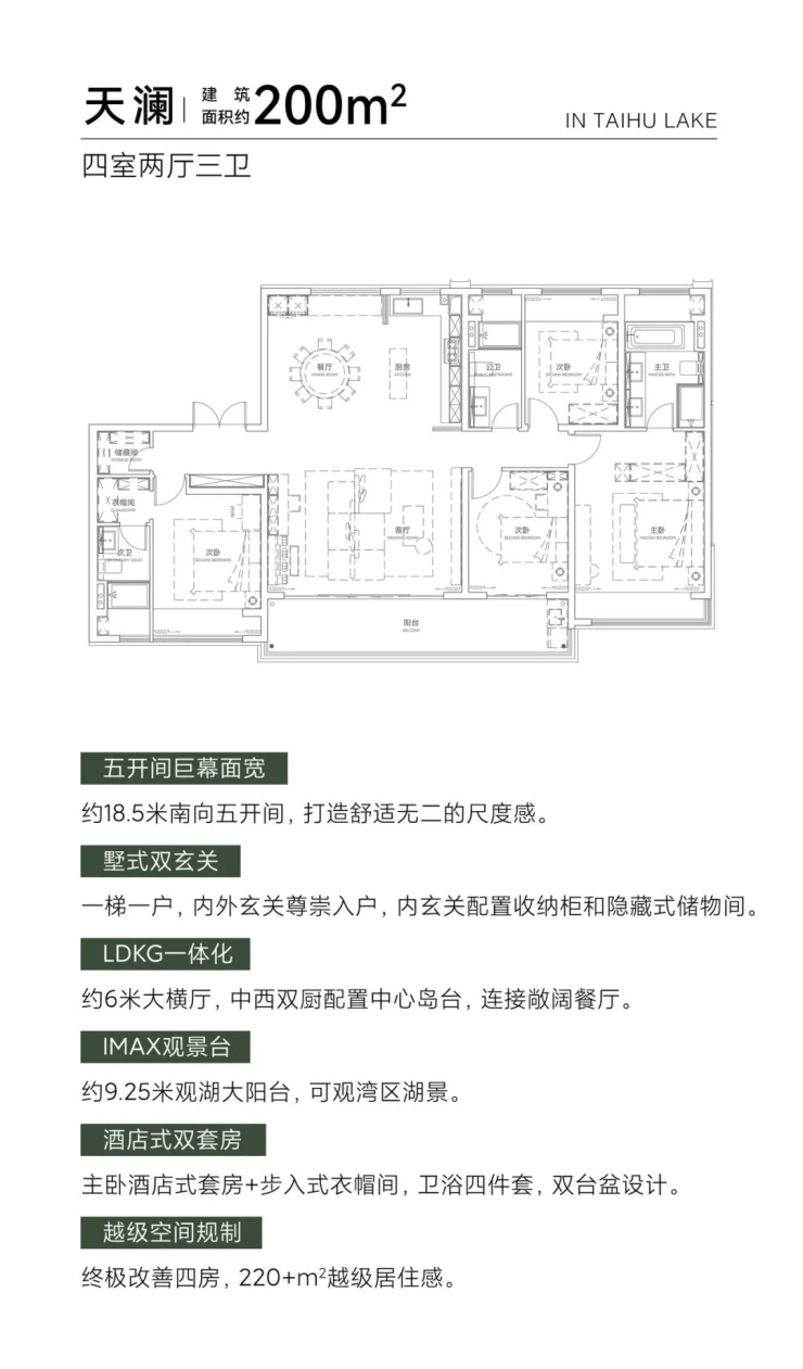 项目打造纯粹大户型社区,主力户型为143-200㎡的四居室,仅440户的规划保证了社区圈层的纯粹性。所有楼栋均采用一梯一户设计,独立前室搭配内外玄关,归家仪式感十足。户型设计上,全系四开间朝南,最大南向面宽可达约18.5米,搭配超9米观景阳台,将湖景与阳光最大限度引入室内。精装交付选用西门子、杜拉维特等国际品牌,细节之处尽显品质。400 998 3632世纪金源近湖源筑营销中心电话