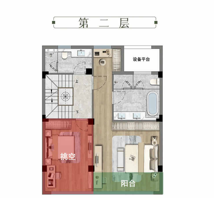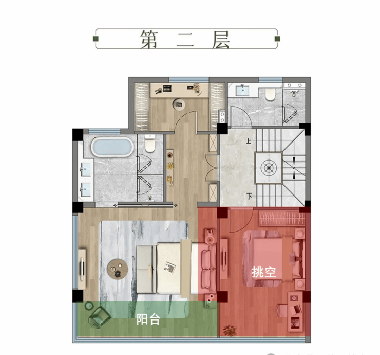 二层,可实现多样化布局。可改约6.4米挑高+南向阳台,根据家庭需要自由定制,可以是2房布局,也可以是家庭第二客厅,工作室、收藏间,灵活性较强。