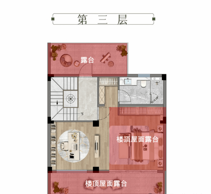 三层,整层套房设计。该层赠送约23㎡的南北双向大露台,这里作为建筑的“空中延伸空间”,兼具视野开阔、采光充足的优势,无论是打造成亲近自然的露台卧室,还是多功能的生活场域,都能极大提升居住体验。