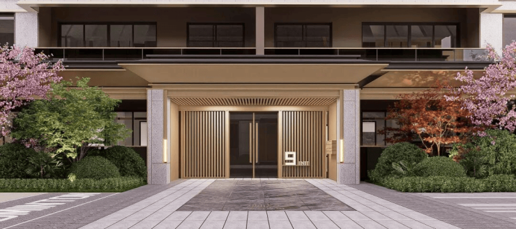 立面上采用中式现代简约风格,大面积玻璃幕墙搭配古铜镶边,将传统中式元素与现代建筑理念完美融合,形成独特的视觉效果。