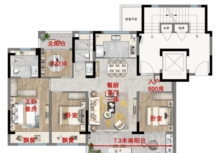 南向7.3米双联阳台,可精心打造成莳花弄草的小花园;北向阳台则可拓展为灵活多变的X空间,既能作为书房、琴房满足日常兴趣需求,也能随着二孩出生摇身一变成为儿童房,让空间始终适配家庭不同阶段的成长需求。