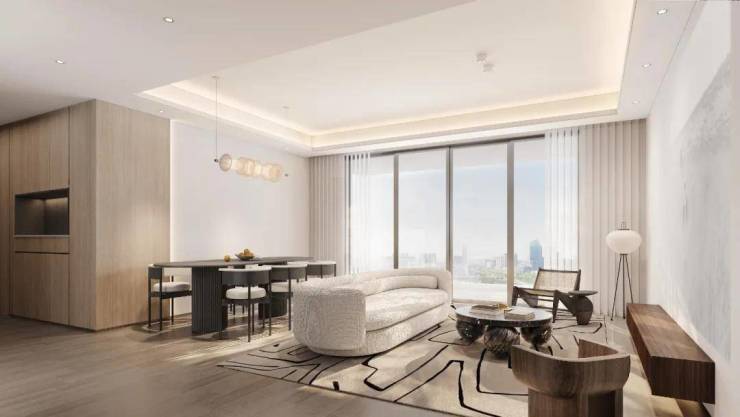 外立面采用甄选材料,以“金属板+大面积三玻两腔LOW-E玻璃”形成轻盈公建化立面,兼顾审美、技艺与品质,大面积三玻两腔玻璃赋予建筑流光镜幕般的澄澈立面,整体更加通透、明亮,映见四季万象。