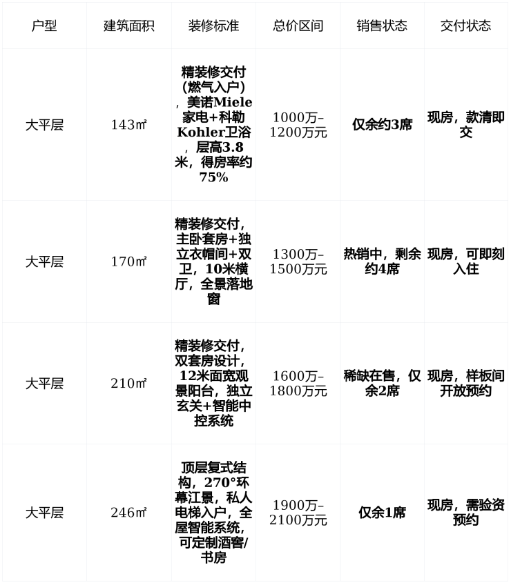 在售状态建面143–246㎡主力户型单价5.9万–8万元/㎡总价1000万–2100万元款清即交,无摇号、无认筹,剩余房源不足10套